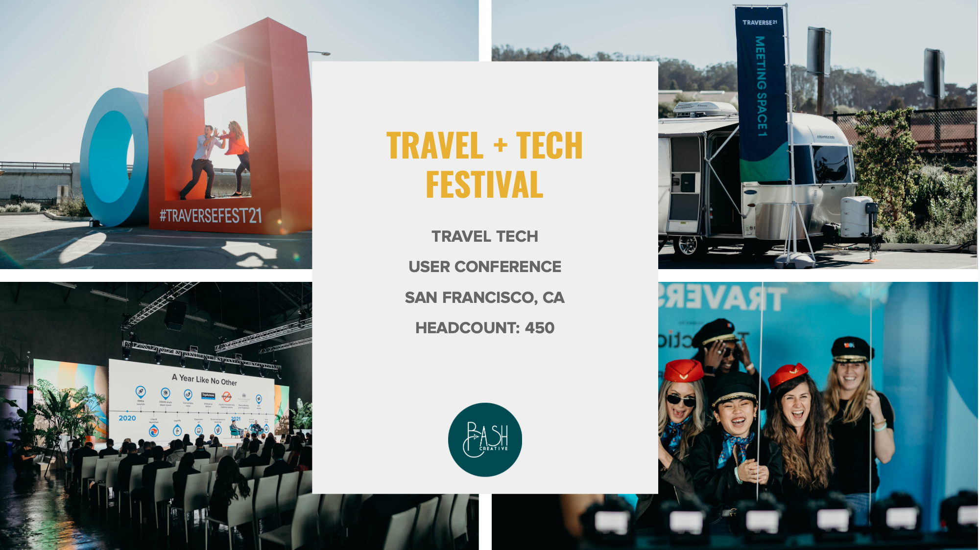 The arrival experience was thoughtful and thorough, with onsite COVID testing facilitated each day for vendors, staff, attendees and speakers. In order to properly activate the large outdoor & indoor space, Bash developed a full-build festival in the parking lot for the lunch keynote and after party. Meanwhile inside the venue, we strategically weaved the luxe main stage, 5 breakout paths, sponsor alley, and customer success lounge to create pockets of learning, networking, and meetings that provided plenty of instagrammable moments.
